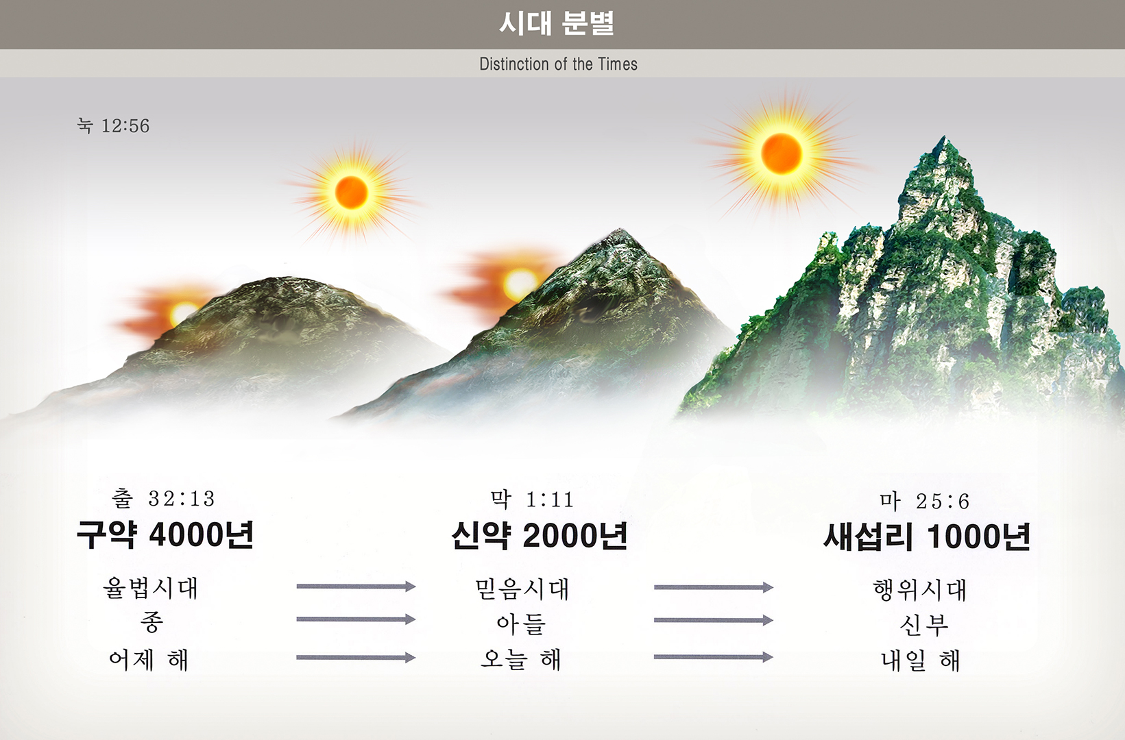 하나님의 섭리역사는 시대와 때를 좇아 진행되기에 자신이 어떤 시대에 살고 있는지 분명히 알아야 한다. 사람이 하나님을 믿고 주님을 믿어도 하나님의 때를 분별할 줄 모르면 그 때에 맞게 하나님을 믿고 섬길 수도 없고 참된 신앙을 할 수 없다. 이스라엘 민족은 하나님을 사랑했지만, 하나님의 때를 몰라 신약시대 예수님을 통해 이루시는 구원역사를 모르고 불신함으로 지금도 구약급에서 살고 있다. 지금 이 시대도 마찬가지다.
