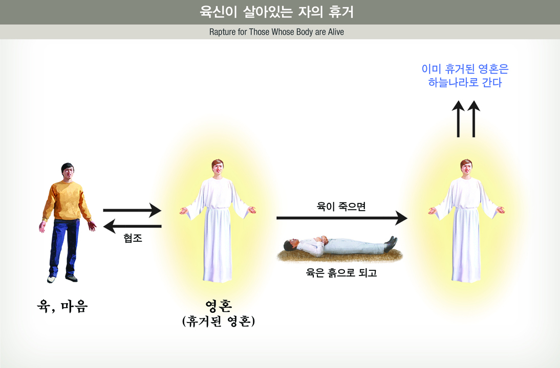 육신이 살아있는 자가 그 영이 휴거되면, 육신이 죽을 때까지 신앙생활을 잘하며 돕다가 죽으면 그동안 행한 모든 공적을 영이 가지고 하늘나라로 가게 된다. 마치, 시집간 여자가 결혼 후에 신랑집에 살면서 친정을 얼마든지 오고 가며 돕듯이, 그 영혼은 육신이 살아있는 동안에 자기 육신을 도우면서 살아간다.
