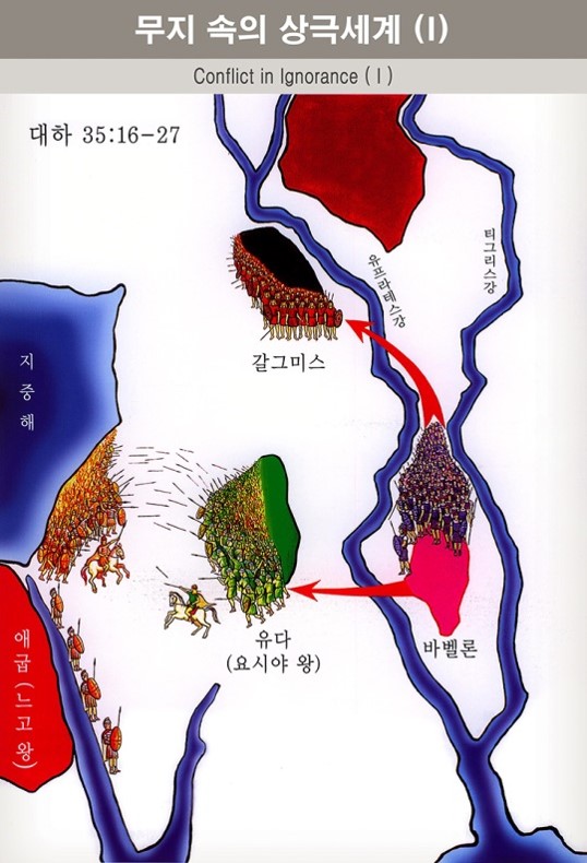 <역대하 35:16~27> ... 이 모든 일 후 곧 요시야가 성전을 정돈하기를 마친 후에 애굽 왕 느고가 유브라데 강가의 갈그미스를 치러 올라왔으므로 요시야가 나가서 방비하였더니 느고가 요시야에게 사신을 보내어 이르되 유다 왕이여 내가 그대와 무슨 관계가 있느냐 내가 오늘 그대를 치려는 것이 아니요 나와 더불어 싸우는 족속을 치려는 것이라 하나님이 나에게 명령하사 속히 하라 하셨은즉 하나님이 나와 함께 계시니 그대는 하나님을 거스르지 말라 그대를 멸하실까 하노라 하나 요시야가 몸을 돌이켜 떠나기를 싫어하고 오히려 변장하고 그와 싸우고자 하여 하나님의 입에서 나온 느고의 말을 듣지 아니하고 므깃도 골짜기에 이르러 싸울 때에 활 쏘는 자가 요시야 왕을 쏜지라 왕이 그의 신하들에게 이르되 내가 중상을 입었으니 나를 도와 나가게 하라 그 부하들이 그를 병거에서 내리게 하고 그의 버금 병거에 태워 예루살렘에 이른 후에 그가 죽으니 그의 조상들의 묘실에 장사 되니라 온 유다와 예루살렘 사람들이 요시야를 슬퍼하고 ...