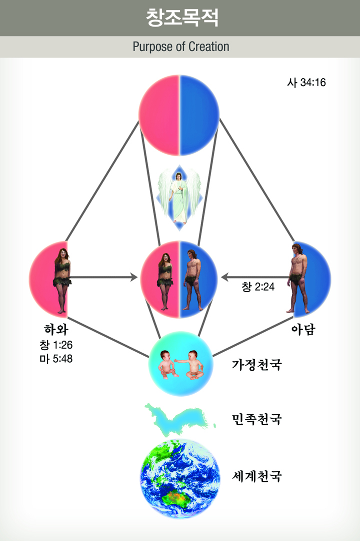 우주를 만든 목적은 지구를 만들기 위함이었고, 지구는 사람의 육이 살아갈 수 있는 환경을 만들기 위함이었으며, 사람의 육은 영을 만들기 위함이었다. 결국 인간의 영을 위해 천지 만물과 지구와 육신을 만든 것이다. 사람을 창조한 하나님은 창조주이시니 아버지라고 하지만, 근본은 신랑이며 사람은 하나님 앞에 신부의 입장이다. 하나님은 마치 남자 앞에 상대되는 여자 입장으로 사람을 창조하셨다.