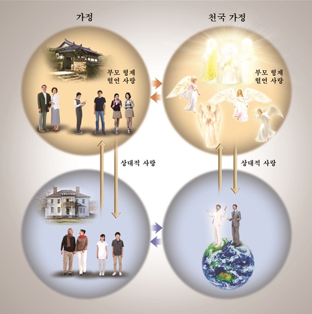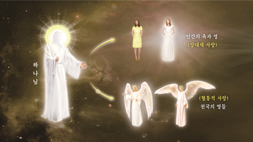 천사는 천국에서 태어난 영체라서 하나님과 동일한 동질적 입장이다. 마치 한 식구 같은 혈통적 관계이며, 남자 앞에 남자와 같은 입장이다. 천사들은 삼위를 모시고 섬기고 사랑하며 영광 돌리지만, 하나님은 천사들의 사랑에 만족하지 못하시고, 원하는 만큼 만족할 만한 사랑을 받기 위해서 인간을 신부격으로 창조하셨다.