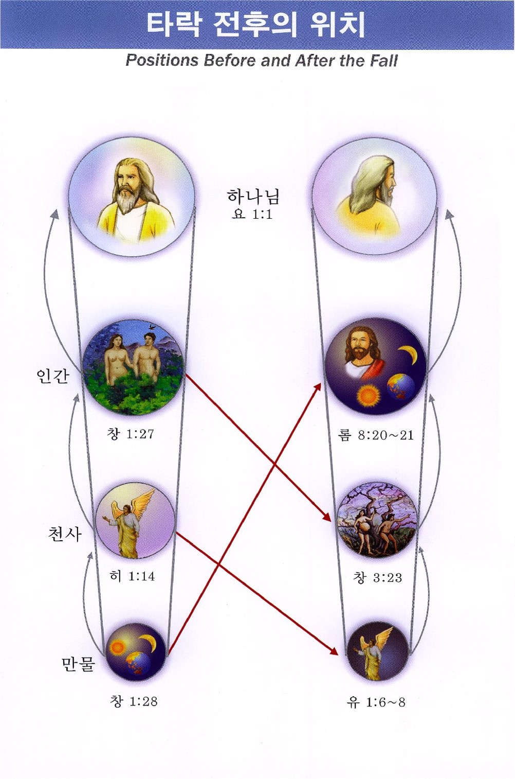 천사는 천국에서 태어난 영체라서 하나님과 동일한 동질적 입장이다. 마치 한 식구 같은 혈통적 관계이며, 남자 앞에 남자와 같은 입장이다. 천사들은 삼위를 모시고 섬기고 사랑하며 영광 돌리지만, 하나님은 천사들의 사랑에 만족하지 못하시고, 원하는 만큼 만족할 만한 사랑을 받기 위해서 인간을 신부격으로 창조하셨다.