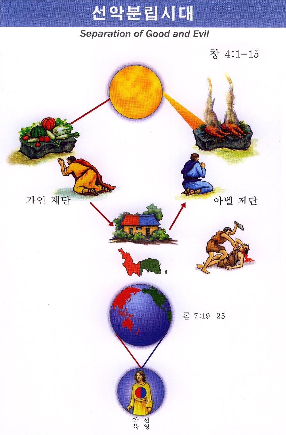 가인과 아벨이 성장한 뒤에, 하나님께서 아벨의 제물은 받으시고 가인 것은 받지 않으셨다. 그 이유는 가인의 중심, 그 마음을 보고 합당치 아니함으로 받지 않으신 것이다. 가인은 보다 선편인 아벨을 중심하지 않고 자기가 직접 제물을 드렸고, 아담과 하와의 타락으로 죄를 짓고 태어났기에 이를 유전으로 받았기 때문이다. 결국, 가인은 동생 아벨을 들에 나가 돌로 쳐 죽이고 말았다.