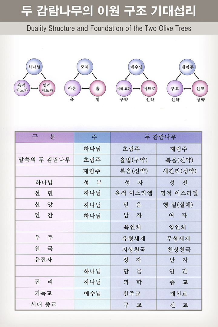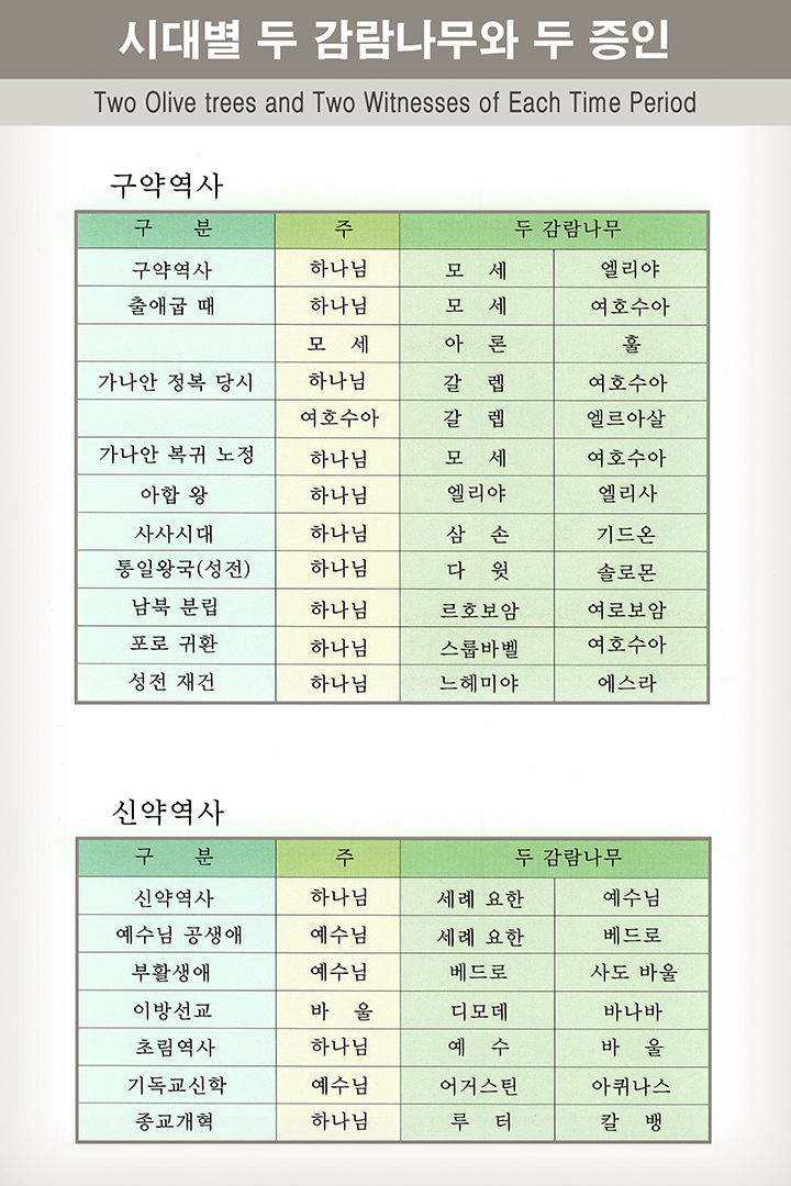 <스가랴 4:11~14> 내가 그에게 물어 이르되 등잔대 좌우의 두 감람나무는 무슨 뜻이니이까 하고 다시 그에게 물어 이르되 금 기름을 흘리는 두 금관 옆에 있는 이 감람나무 두 가지는 무슨 뜻이니이까 하니 그가 내게 대답하여 이르되 네가 이것이 무엇인지 알지 못하느냐 하는지라 내가 대답하되 내 주여 알지 못하나이다 하니 이르되 이는 기름 부음 받은 자 둘이니 온 세상의 주 앞에 서 있는 자니라 하더라